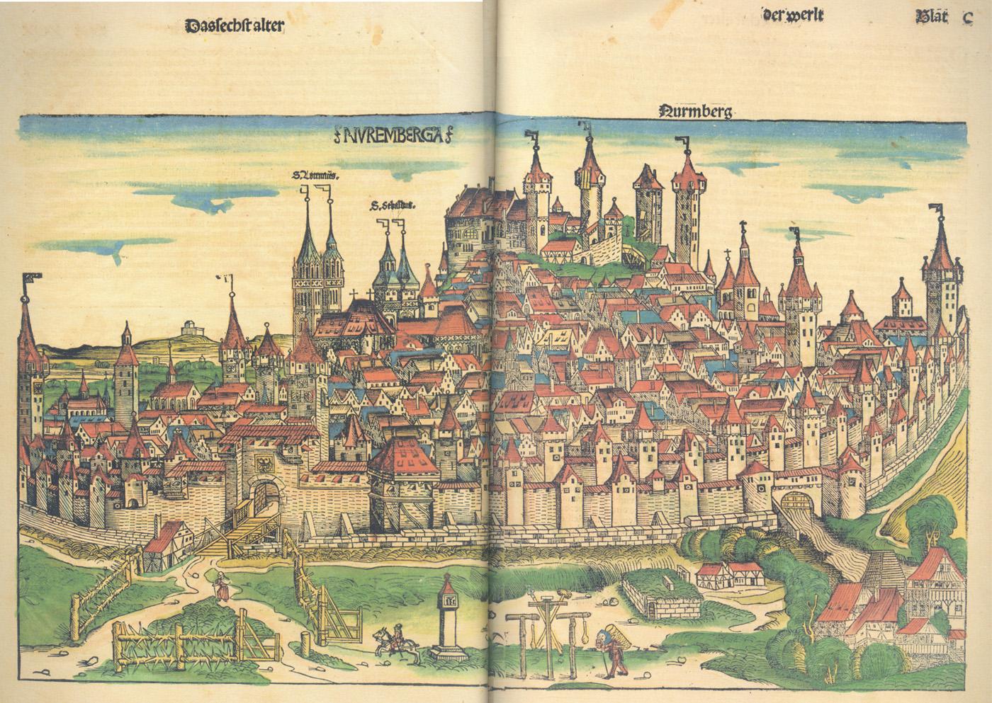 [ Druckansicht ] Zoom: [ + ] [ 1:1 ] [ Standard ] [ - ] [ Abb. vergrößert in extra Fenster öffnen ]Zum Scrollen der Abbildung bitte die unter dem Bild angebrachte Scrollleiste bedienen. Ansicht von Nürnberg, Quelle: Hartmann Schedel: Weltchronik. Kolorierte Gesamtausgabe von 1493. Einleitung und Kommentar von S. Füssel. Köln u.a. 2001, fol. XCIXb u. Ca.Zugeordnet bei:MRFH 2220 Schedel, Hartmann (Biographie)