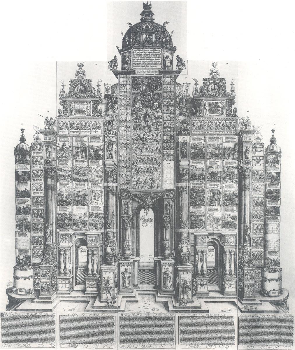 [ Druckansicht ] Zoom: [ + ] [ 1:1 ] [ Standard ] [ - ] [ Abb. vergrößert in extra Fenster öffnen ]Zum Scrollen der Abbildung bitte die unter dem Bild angebrachte Scrollleiste bedienen. Die Ehrenpforte Kaiser Maximilians I. Quelle: Kaiser Maximilian I. Bewahrer und Reformer. Katalog zur gleichnamigen Ausstellung. Hg. von G. Schmidt-von Rhein. Ramstein 2002, S. 337.Zugeordnet bei:MRFH 1720 Maximilian I. (Biographie)