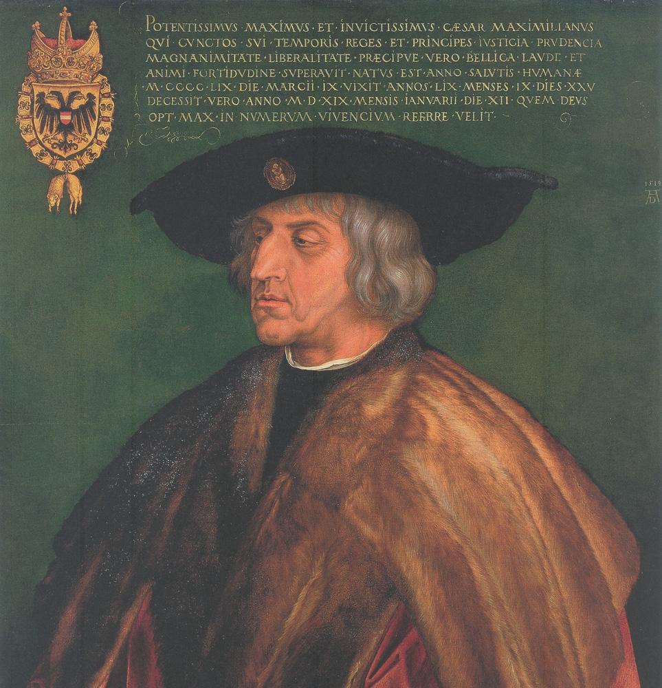 Bildnis Kaiser Maximilians I. von Albrecht Dürer. Quelle: FÜSSEL, S.: Der Theuerdank von 1517. Kaiser Maximilian und die Medien seiner Zeit. Eine kulturhistorische Einführung. Köln u.a. 2003, S. 9. ![]() Zugeordnet bei: