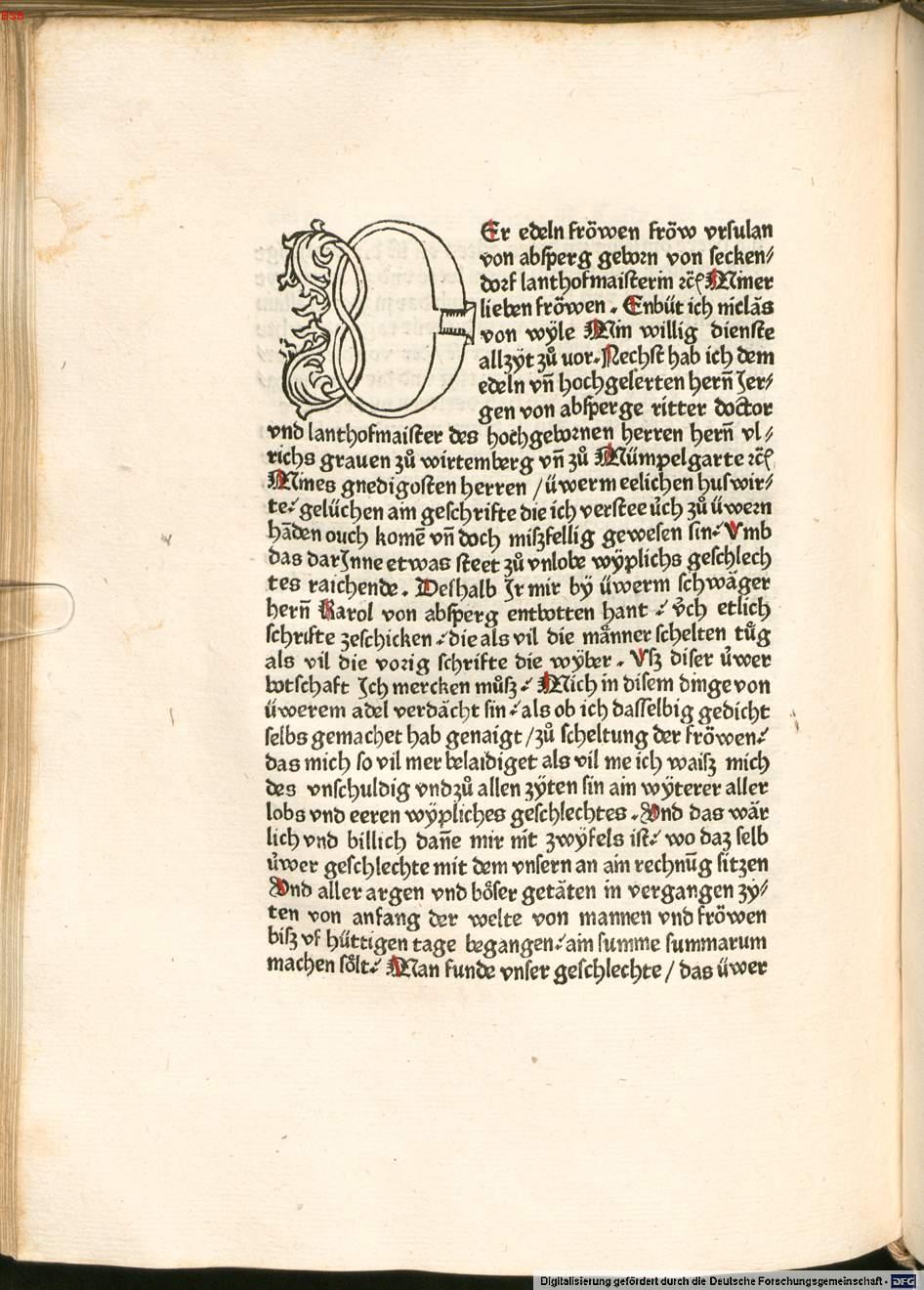 [ Druckansicht ] Zoom: [ + ] [ 1:1 ] [ Standard ] [ - ] [ Abb. vergrößert in extra Fenster öffnen ]Zum Scrollen der Abbildung bitte die unter dem Bild angebrachte Scrollleiste bedienen. Widmung der 16. Translation von Niklas von Wyle an Ursula von Absberg. Quelle: München, BSB, 2 Inc.s.a. 1106a/1, Bl. 225b.Zugeordnet bei:MRFH 0121 Ursula von Absberg (Biographie)