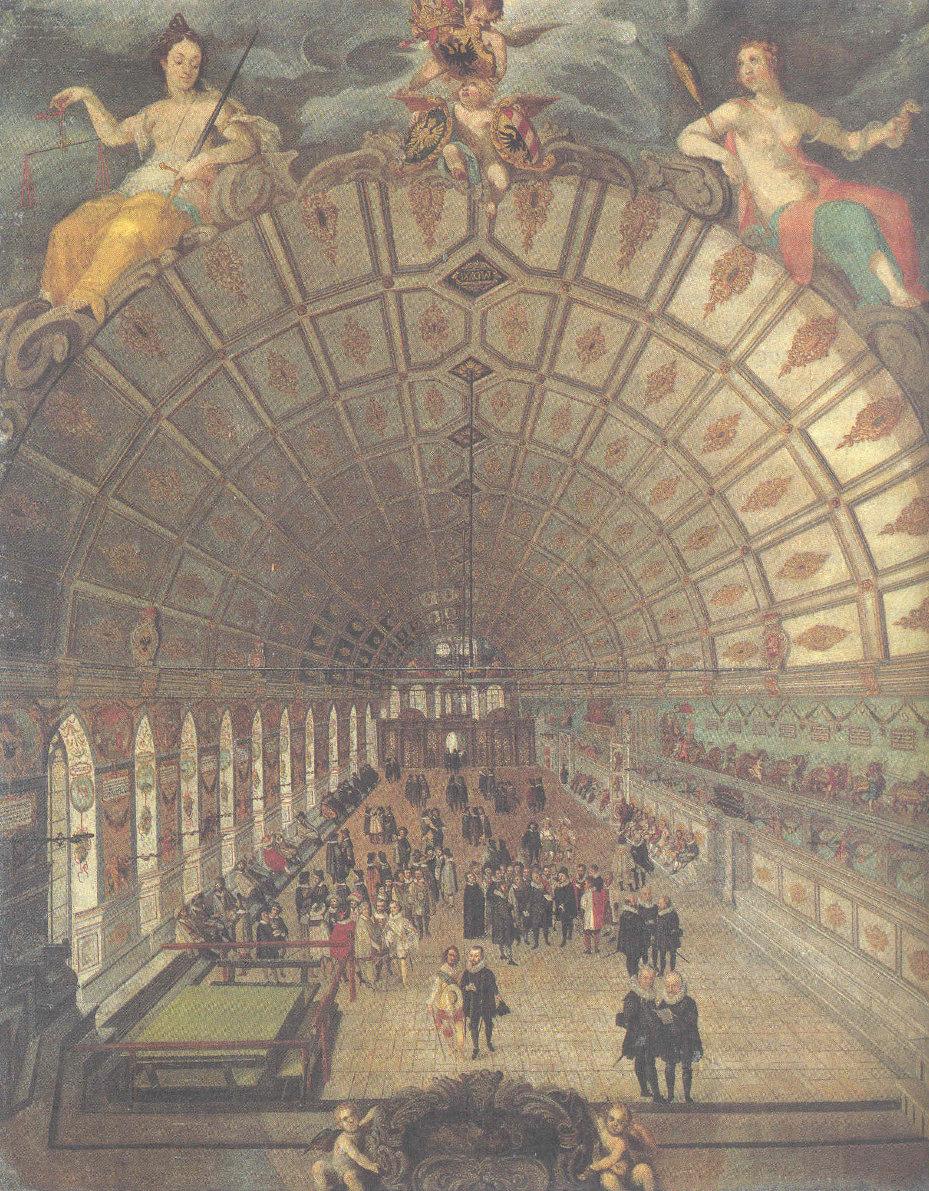 [ Druckansicht ] Zoom: [ + ] [ 1:1 ] [ Standard ] [ - ] [ Abb. vergrößert in extra Fenster öffnen ]Zum Scrollen der Abbildung bitte die unter dem Bild angebrachte Scrollleiste bedienen. Nürnberger Rathaussaal (1626). Quelle: Diefenbacher, M. / Endres, R. (Hgg.): Stadtlexikon Nürnberg. Nürnberg 22000, S. 856.Zugeordnet bei:MRFH 2000 Nürnberger Rat (Biographie)