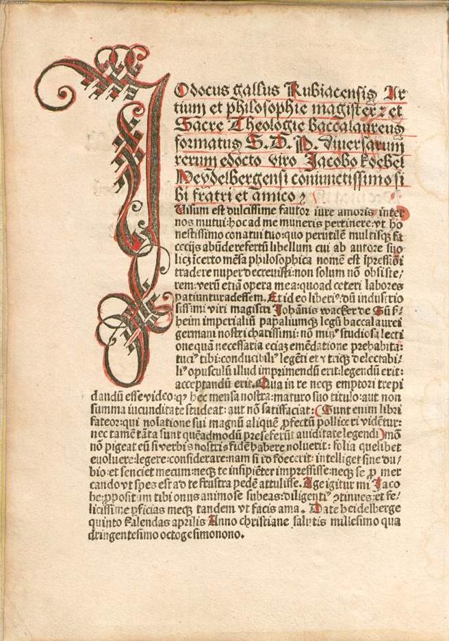 [ Druckansicht ] Zoom: [ + ] [ 1:1 ] [ Standard ] [ - ] [ Abb. vergrößert in extra Fenster öffnen ]Zum Scrollen der Abbildung bitte die unter dem Bild angebrachte Scrollleiste bedienen. Quelle: Jodocus Gallus: Mensa philosophica mit Brief an Jakob Köbel, Heidelberg 28. 3. 1489; Heidelberg: [Heinrich Knoblochtzer für] Jakob Köbel, [nach 28. März] 1489 = GW M22814; Ex. München, BSB, 4 Inc.s.a. 1449 b, Bl. 1b.Zugeordnet bei:MRFH 0670 Gallus, Jodocus (Jost von Rufach) (Biographie)