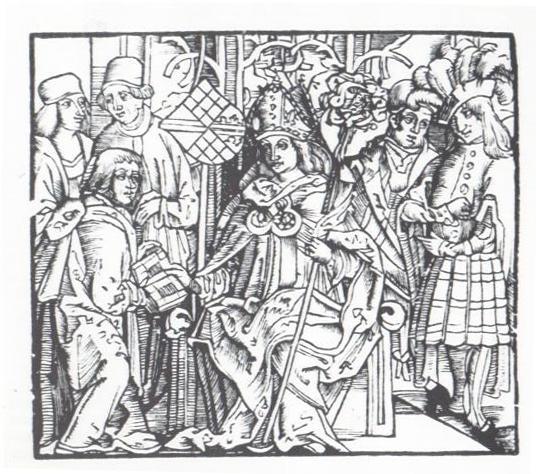 Jakob Wimpfeling überreicht dem Adressaten seiner Geschichte der Straßburger Bischöfe, Bischof Wilhelm von Hohnstein, ein Exemplar des Werkes