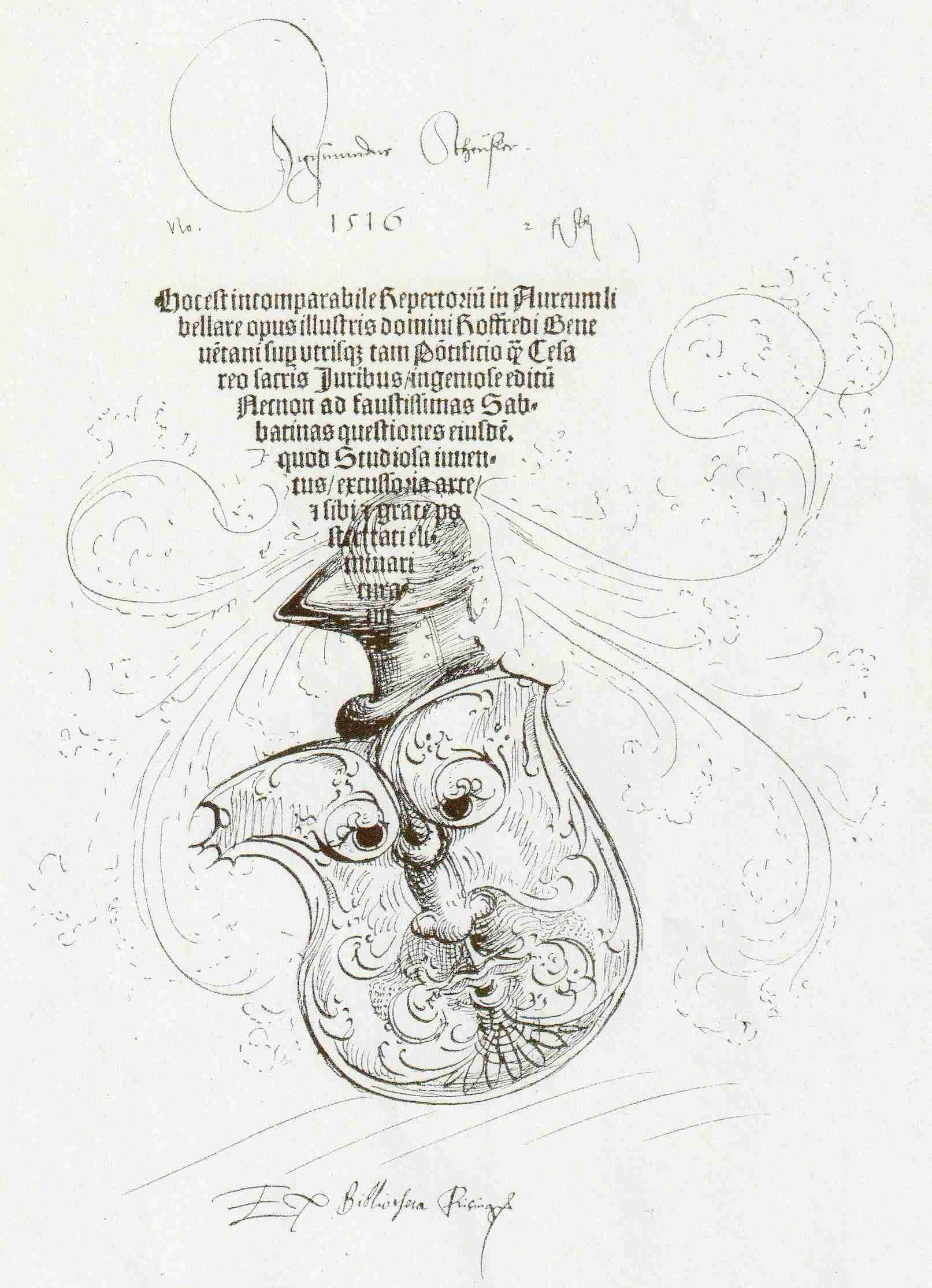 Namenseintrag und Federzeichnung Scheuflers. Quelle: Schottenloher, K.: Der Freisinger Domherr und Humanist Dr. Sigismund Scheufler (1475-1522). Ein Beitrag zur Geschichte der Freisinger Dombibliothek. In: Schlecht, J. (Hg.): Wissenschaftliche Festgabe zum zwölfhundertjährigen Jubiläum des heiligen Korbinian. Mit 29 Tafeln, 61 Textabbildungen und 1 Karte. München 1924, S. 376-402, Tafel 18.