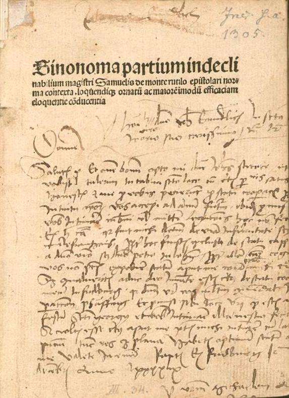 Samuel Karoch: Synonyma partium indeclinabilium. Druck: Leipzig: Wolfgang Stöckel, C. 1497, 1. Ex.