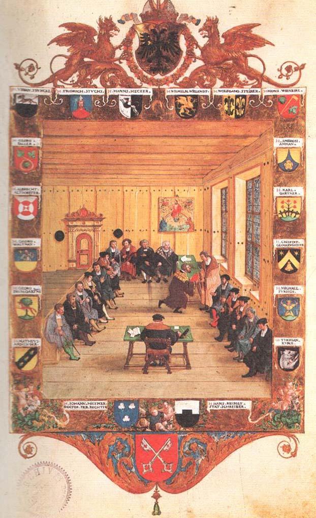 Hans Mielich: Übergabe des Freiheitsbuches der Freien Reichsstadt Nürnberg. Vorne am Tisch: Hans Reisolt, Vater oder Sohn (vgl. Poeck). Quelle: PFEIFFER, W.: Hans Mielich (1516–1573). Übergabe des Freiheitsbuches der Freien Reichsstadt Regensburg. In: Mielke, H. (Hg.): Albrecht Altdorfer. Zeichnungen, Deckfarbenmalerei, Druckgraphik. Berlin 1988, Abb. S. 23.