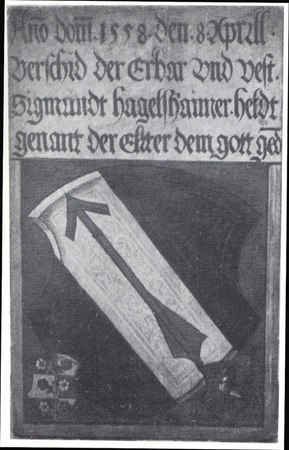 Totenschild Sigmund Helds, genannt Hagelsheimer (1558). St. Lorenzkirche, Nürnberg. Quelle: Bauer, H./Stolz, G. (Hgg.): Wappen in Fülle. Wappenkunde — Wappenkunst — Wappenrecht. Verein zur Erhaltung der St. Lorenzkirche in Nürnberg, NF 31 (1986), S. 49.