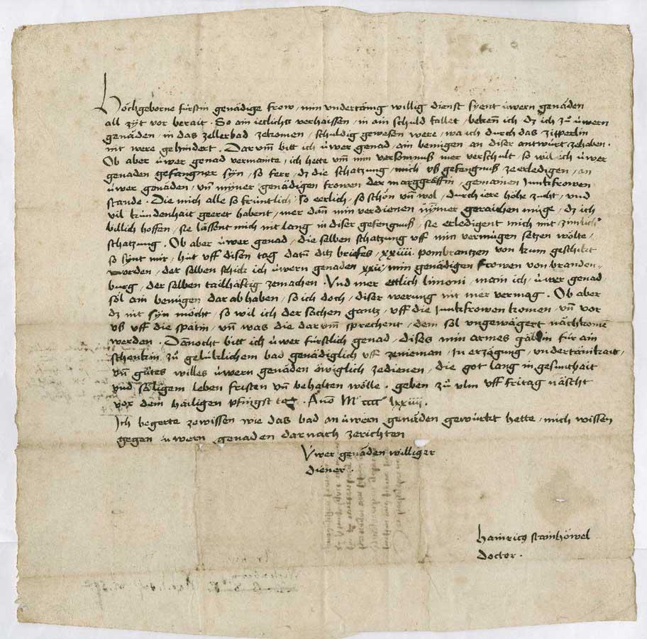 [ Druckansicht ] Zoom: [ + ] [ 1:1 ] [ Standard ] [ - ] [ Abb. vergrößert in extra Fenster öffnen ]Zum Scrollen der Abbildung bitte die unter dem Bild angebrachte Scrollleiste bedienen. Autograph Steinhöwels. Brief an Margarete von Württemberg.Ulm, 27. Mai 1474.Quelle: Stuttgart, SArch, A 602 Nr 260.Zugeordnet bei:MRFH 0035 Steinhöwel, Heinrich (Biographie)MRFH 1660 Margarethe von Savoyen (Biographie)