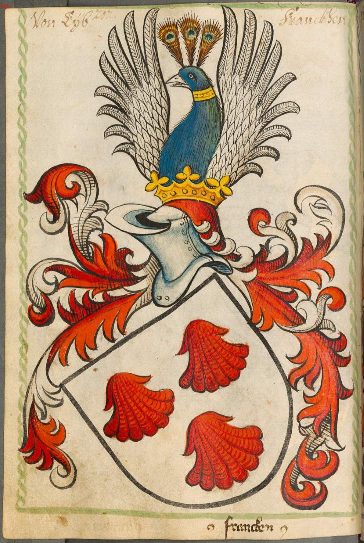 [ Druckansicht ] Zoom: [ + ] [ 1:1 ] [ Standard ] [ - ] [ Abb. vergrößert in extra Fenster öffnen ]Zum Scrollen der Abbildung bitte die unter dem Bild angebrachte Scrollleiste bedienen. Wappen derer von Eyb aus Scheibler'sches Wappenbuch, München, BSB, Cod. icon. 312 c, S. 202.Zugeordnet bei:MRFH 0002 Albrecht von Eyb (Biographie)