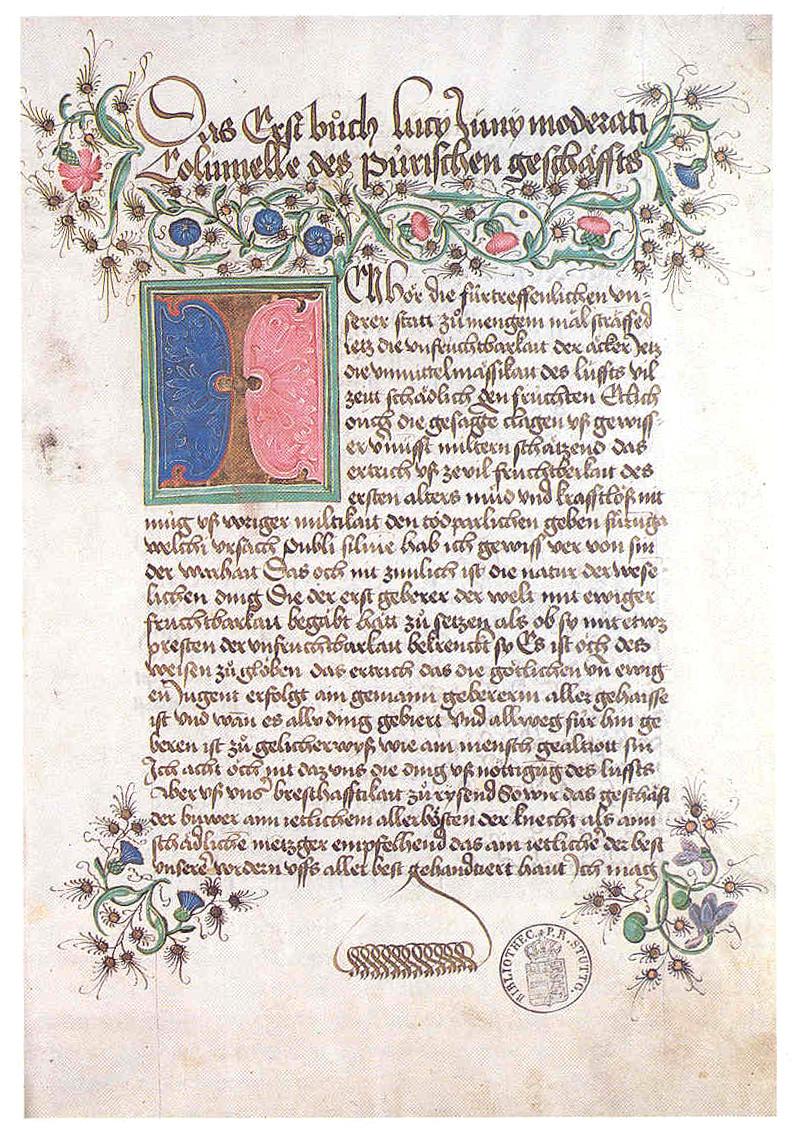 [ Druckansicht ] Zoom: [ + ] [ 1:1 ] [ Standard ] [ - ] [ Abb. vergrößert in extra Fenster öffnen ]Zum Scrollen der Abbildung bitte die unter dem Bild angebrachte Scrollleiste bedienen. Stuttgart, WLB, Cod. cam. et oec. 2°1, Bl. 2r, Quelle: Fischer, J. / Amelung, P. / Irtenkauf, W.: Württemberg im Spätmittelalter. Ausstellung des Hauptstaatsarchivs Stuttgart und der Württ. Landesbibliothek. Stuttgart 1985, S. 137, Abb. 49.Zugeordnet bei:MRFH 0022 Österreicher, Heinrich (Biographie)MRFH 10960 Stuttgart, Württembergische Landesbibliothek, Cod. cam. et oec. 2° 1 (Handschriftenbeschreibung)