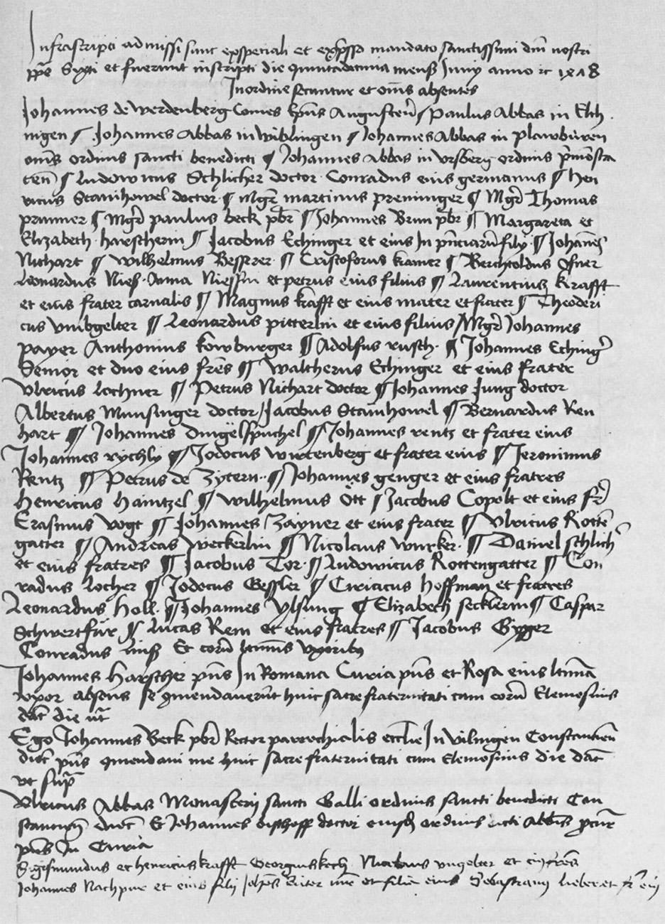 Bruderschaftsbuch der Heiliggeist-Bruderschaft zu Rom, Bl. 457a, Einträge vom 15. Juni 1478, Quelle: Amelung, P.: Der Frühdruck im deutschen Südwesten 1473-1500. Eine Ausstellung der Württemb. Landesbibl. Stuttgart 1979 Nr. 32, Abb. 71.