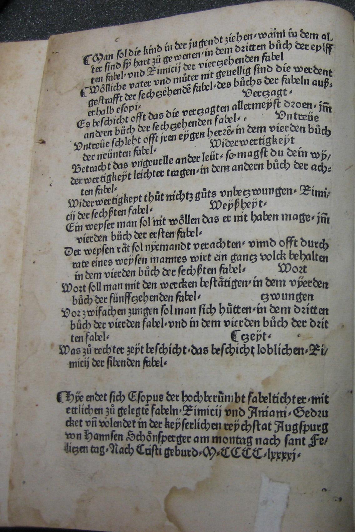 [ Druckansicht ] Zoom: [ + ] [ 1:1 ] [ Standard ] [ - ] [ Abb. vergrößert in extra Fenster öffnen ]Zum Scrollen der Abbildung bitte die unter dem Bild angebrachte Scrollleiste bedienen. Quelle: Berlin, SBB, Inc. 220 (mit freundlicher Genehmigung der SB).Zugeordnet bei:MRFH 20110 Augsburg: Johann Schönsperger, am montag nach sant Feliczen tag [17. Januar] 1491 (Druckbeschreibung)