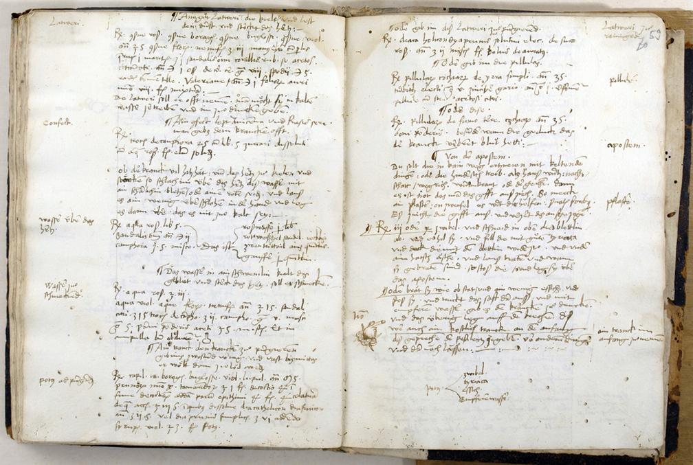 [ Druckansicht ] Zoom: [ + ] [ 1:1 ] [ Standard ] [ - ] [ Abb. vergrößert in extra Fenster öffnen ]Zum Scrollen der Abbildung bitte die unter dem Bild angebrachte Scrollleiste bedienen. Augsburg, SStB, 4° Cod. 121, Bl. 58v-59rZugeordnet bei:MRFH 10010 Augsburg, Staats- und Stadtbibliothek, 4° Cod. 121 (Handschriftenbeschreibung)