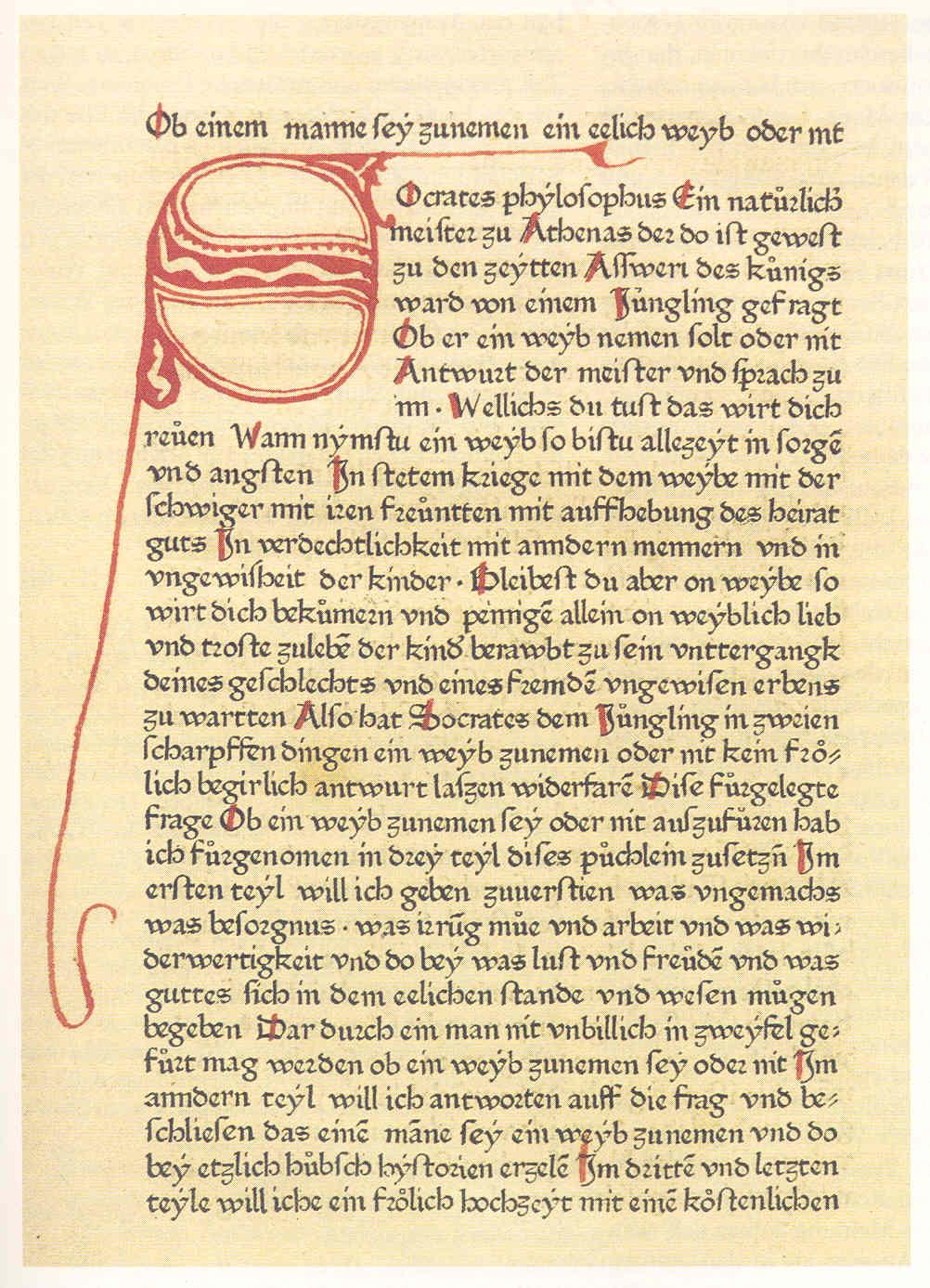 Beginn des 'Ehebüchleins' (Augsburg, SStB, 2 an 2° Ink. 64). Quelle: Rautenberg, U. (Hg.): Über die Ehe. Von der Sachehe zur Liebesheirat. Eine Literaturausstellung in der Bibliothek Otto Schäfer, Schweinfurt 18. April — 31. Oktober 1993. Schweinfurt 1993, S. 49.