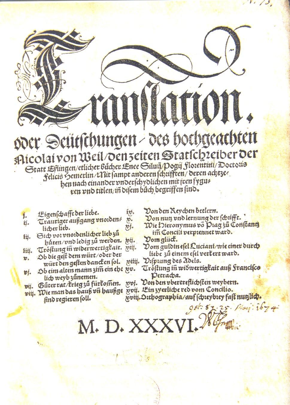 Quelle: Voss, F.: „Zu höchstgelerter mannen rät und lere“. Der Geist des Humanismus: Niklas von Wyle, Heinrich Steinhöwel und Konrad Fyner. In: Literarische Spuren in Esslingen. Hg. v. Irene Ferchl, Ute Harbusch und Thomas Scheuffelen. Esslingen 2003. S. 20-31, Abb. S. 20.