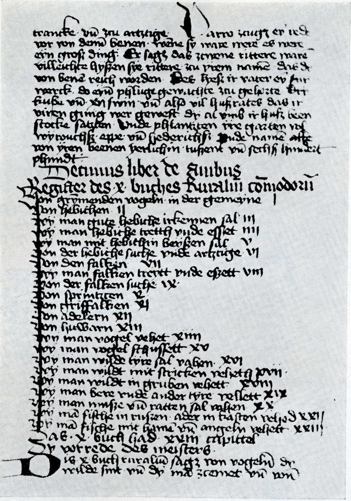 Quelle: Lindner, K. (Hg.): Das Jagdbuch des Petrus de Crescentiis in deutschen Übersetzungen des 14. und 15. Jahrhunderts (Quellen und Studien zur Geschichte der Jagd 4). Berlin 1957, Abb. II. ![]() Zugeordnet bei: