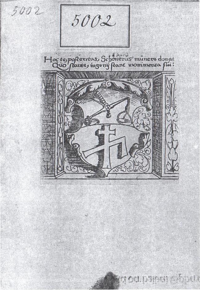 Gedrucktes Exlibris. Wien, ÖNB, Cod. 5002. Quelle: Maruska, M.: Die Handschriften aus der Bibliothek des fränkischen Gelehrten Johannes Schöner in der Österreichischen Nationalbibliothek. In: Mühlberger, K. / Maisel, T. (Hgg.): Aspekte der Bildungs- und Universitätsgeschichte. 16. bis 19. Jahrhundert (Schriftenreihe des Universitätsarchivs Universität Wien 7). Wien 1993, S. 409-431, Abb. S. 433.