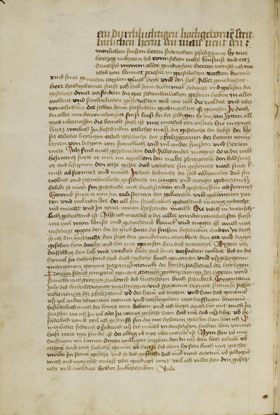 [ Druckansicht ] Zoom: [ + ] [ 1:1 ] [ Standard ] [ - ] [ Abb. vergrößert in extra Fenster öffnen ]Zum Scrollen der Abbildung bitte die unter dem Bild angebrachte Scrollleiste bedienen. Deutsche Widmung in der 'Chronik' des Matthias von Kemnat, überliefert in der Handschrift Heidelberg, UB, Cod. Heid. N.F. 9, Abb. Bl. 1v. Quelle: Universitätsbibliothek Heidelberg: Heidelberger historische Bestände — digital (online zur Hs.).Zugeordnet bei:MRFH 0019 Matthias von Kemnat (Biographie)