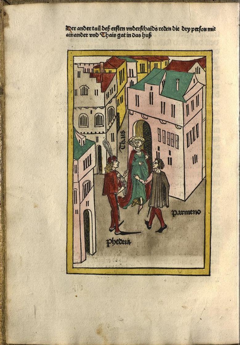 [ Druckansicht ] Zoom: [ + ] [ 1:1 ] [ Standard ] [ - ] [ Abb. vergrößert in extra Fenster öffnen ]Zum Scrollen der Abbildung bitte die unter dem Bild angebrachte Scrollleiste bedienen. Ulmer Terenz, Erstdruck K. Dinckmut 1486, Bl. ii verso, Quelle: online.Zugeordnet bei:MRFH 0020 Neithart, Hans (Biographie)