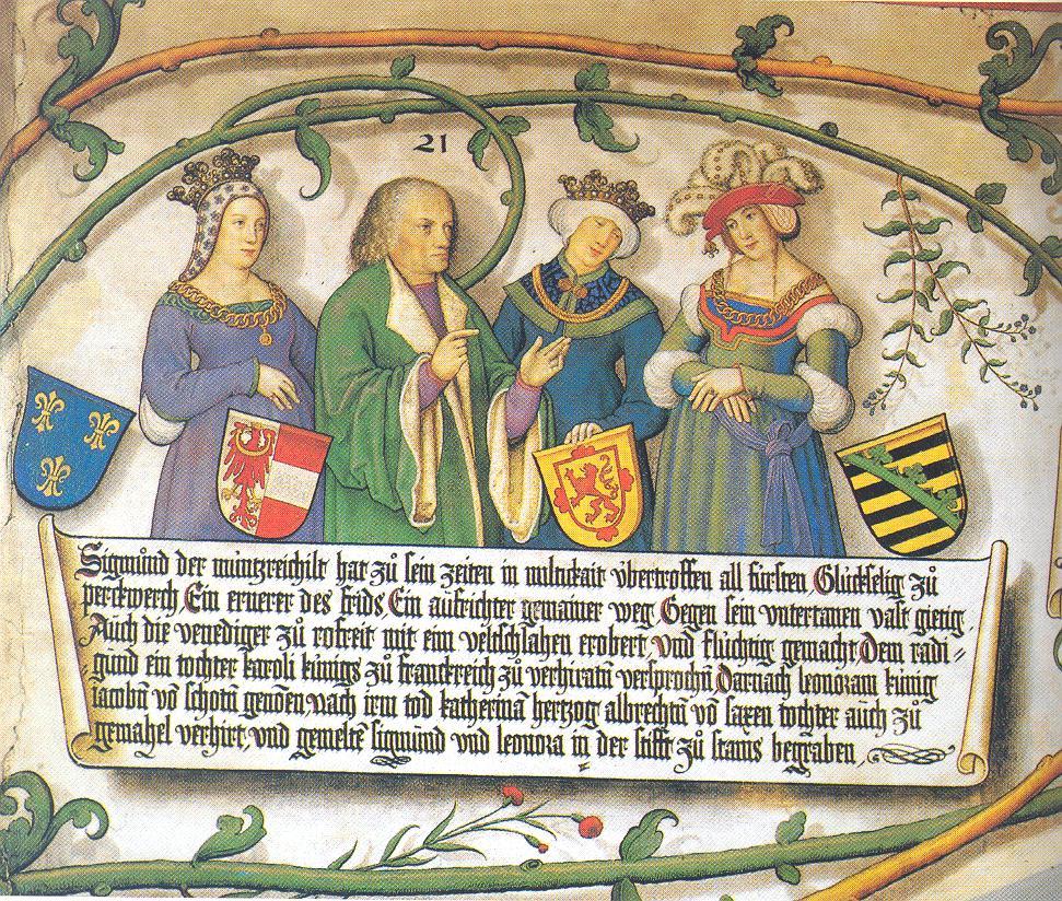 Sigmund von Tirol mit seinen drei Frauen Eleonore von Österreich (mit Löwenwappen), Katherina von Sachsen (mit sächs. Wappen rechts) und seiner Braut Radegunde von Frankreich (links mit Lilienwappen) im Habsburgerstammbaum von Schloss Tratzberg von 1506. Quelle: Baum, W.: Sigmund der Münzreiche. Zur Geschichte Tirols und der habsburgischen Länder im Spätmittelalter (Schriftenreihe des Südtiroler Kulturinstitutes 14). Bozen 1987, S. 362. ![]() Zugeordnet bei: