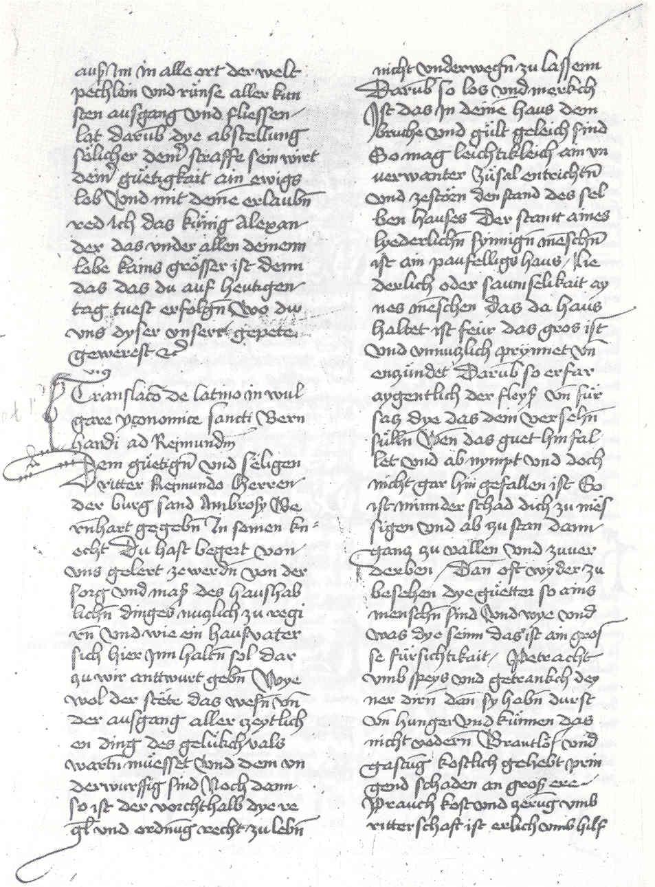 Innsbruck, Universitätsbibliothek, Cod. 979, Bl. 107r. Quelle: Cossar, C. D. M.: The German Translations of the Pseudo-Bernhardine Epistola de cura rei familiaris (Göppinger Arbeiten zur Germanistik 166). Göppingen 1975, Abb. 20.