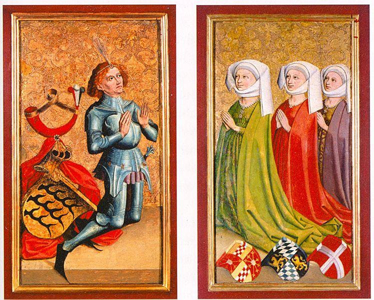 Ulrich V. von Württemberg und seine drei Ehefrauen Margarethe von Savoyen, Elisabeth von Bayern-Landshut und Margarethe von Cleve (von rechts nach links) (um 1470-80), Württem. Landesmuseum, Stuttgart.