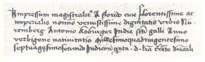 Handschriftliches Kolophon Albrechts von Eyb (SStB Augsburg, 2 an 2° Ink. 64). Quelle: Rautenberg, U. (Hg.): Über die Ehe. Von der Sachehe zur Liebesheirat. Eine Literaturausstellung in der Bibliothek Otto Schäfer, Schweinfurt 18. April — 31. Oktober 1993. Schweinfurt 1993, S. 49.