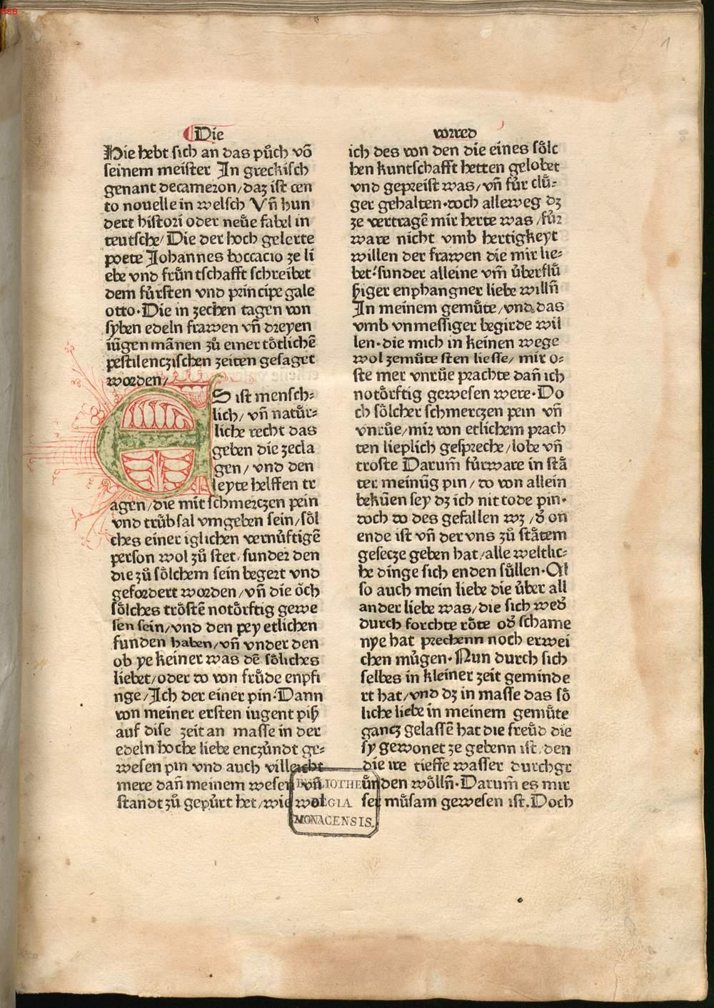 [ Druckansicht ] Zoom: [ + ] [ 1:1 ] [ Standard ] [ - ] [ Abb. vergrößert in extra Fenster öffnen ]Zum Scrollen der Abbildung bitte die unter dem Bild angebrachte Scrollleiste bedienen. Beginn des 'Decameron'-Erstdrucks. Quelle: München, BSB, 2 Inc.s.a 218, Bl. 1a.Zugeordnet bei:MRFH 0004 Arigo (Biographie)