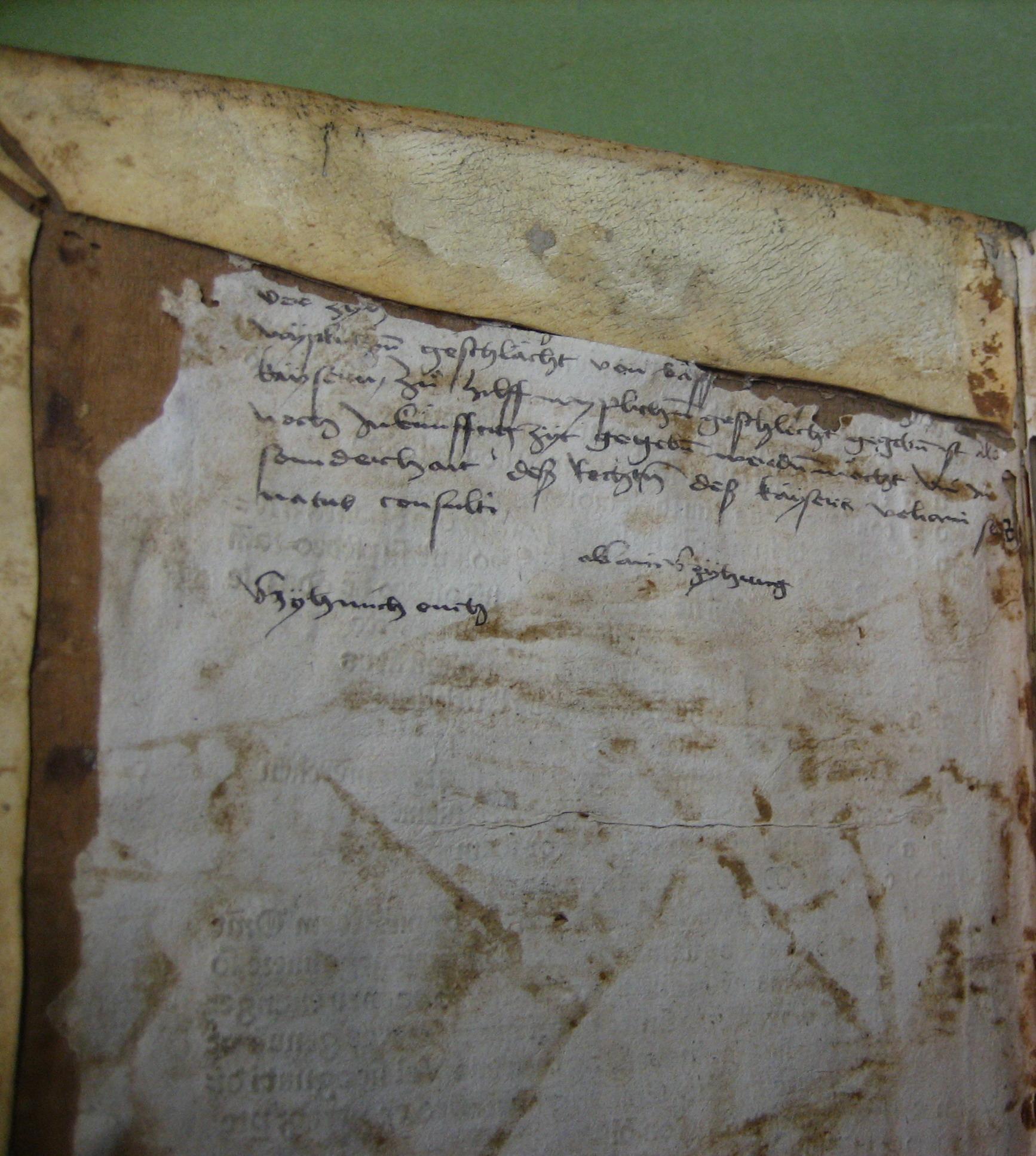 [Esslingen: Konrad Fyner, nach dem 5. April 1478], Ex. Berlin, SB, hs. Eintrag auf Makulaturbl. (Rückseite vorne)