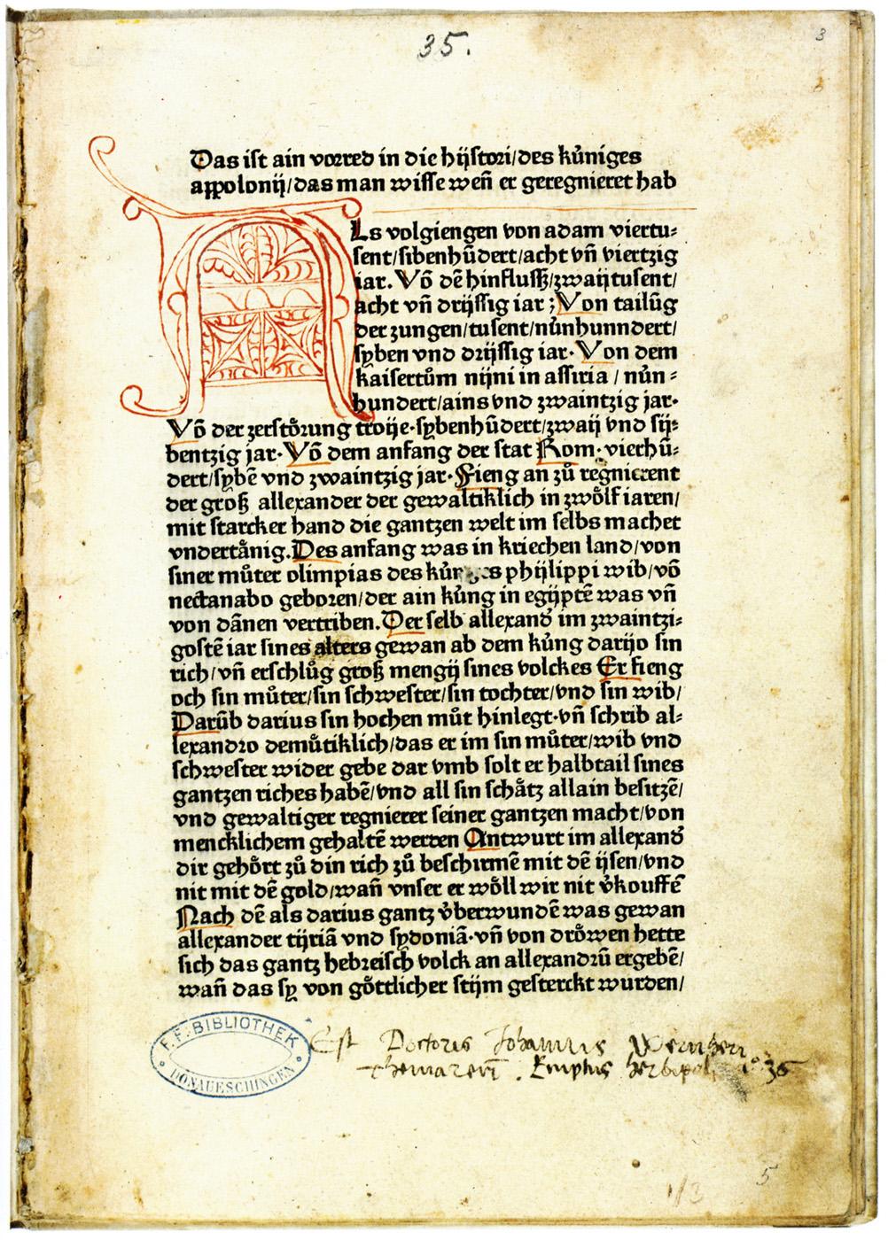 [ Druckansicht ] Zoom: [ + ] [ 1:1 ] [ Standard ] [ - ] [ Abb. vergrößert in extra Fenster öffnen ]Zum Scrollen der Abbildung bitte die unter dem Bild angebrachte Scrollleiste bedienen. Quelle: Günther 2 = Arnim, M. v.: Fünfundfünfzig frühe deutsche Drucke (1471-1554). Katalog 2. Hamburg 1995, S. 12.Zugeordnet bei:MRFH 20180 Augsburg: Günther Zainer, 1471 (Druckbeschreibung)