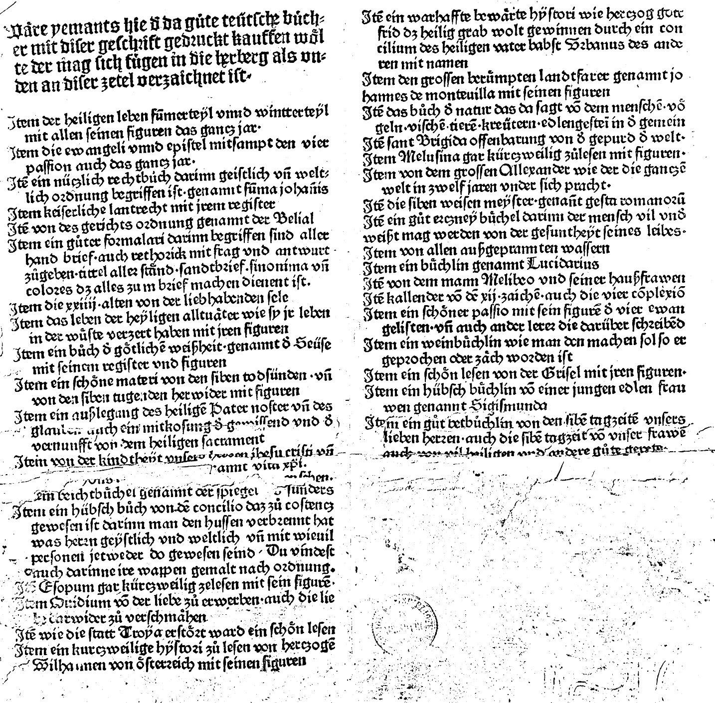 [ Druckansicht ] Zoom: [ + ] [ 1:1 ] [ Standard ] [ - ] [ Abb. vergrößert in extra Fenster öffnen ]Zum Scrollen der Abbildung bitte die unter dem Bild angebrachte Scrollleiste bedienen. Quelle: Burger, K.: Buchhändleranzeigen des 15. Jahrhunderts. In getreuer Nachbildung. Leipzig 1907, S. 12 u. Tafel Nr. 26.Zugeordnet bei:MRFH 21100 [Augsburg: Anton Sorg, 1478] (Druckbeschreibung)MRFH 21110 [Augsburg: Anton Sorg, um 1478-80] (Druckbeschreibung)MRFH 20070 Augsburg: Anton Sorg, montag nach Agathe [10. Februar] 1483 (Druckbeschreibung) [Augsburg: Anton Sorg, um 1478-80] (Drucke - Literaturverzeichnis) [Augsburg: Anton Sorg, 1478] (Drucke - Literaturverzeichnis)