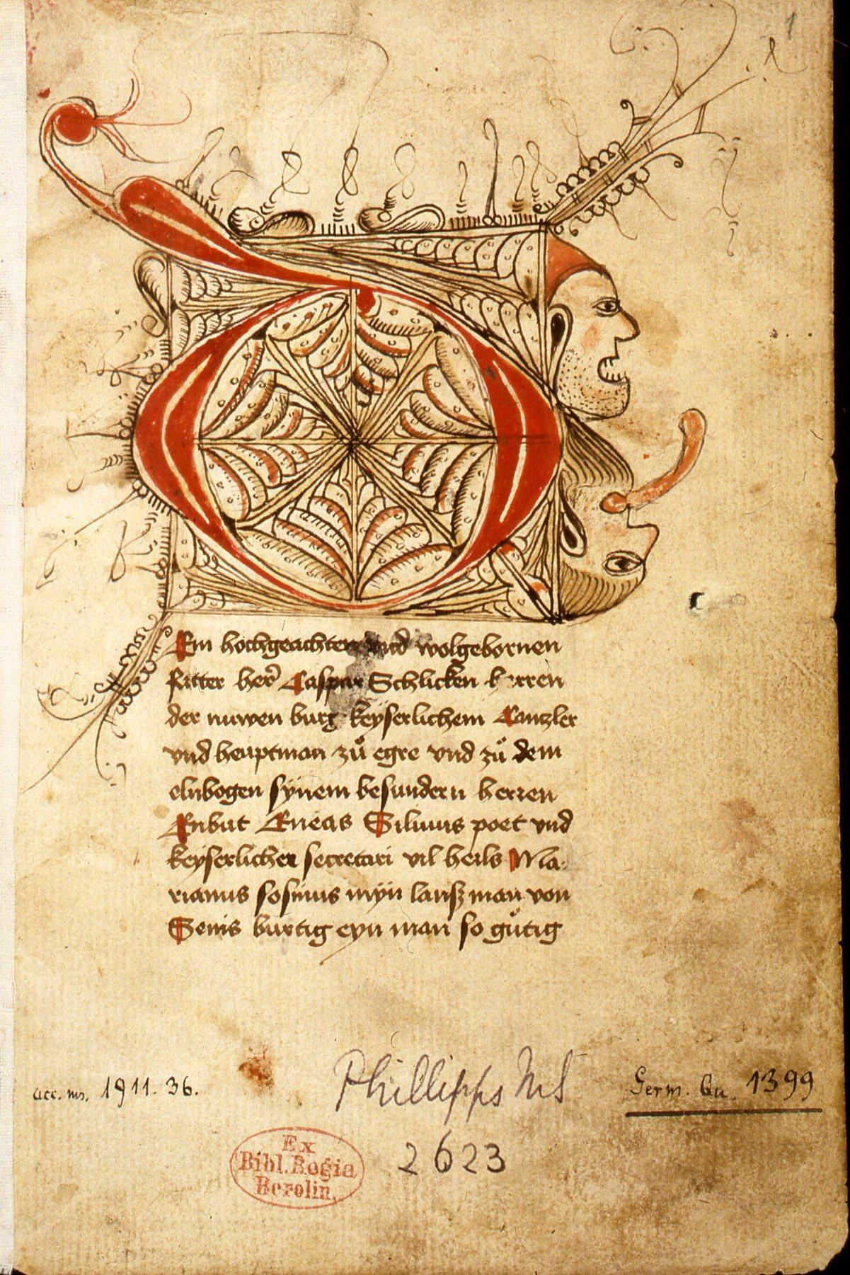 [ Druckansicht ] Zoom: [ + ] [ 1:1 ] [ Standard ] [ - ] [ Abb. vergrößert in extra Fenster öffnen ]Zum Scrollen der Abbildung bitte die unter dem Bild angebrachte Scrollleiste bedienen. Quelle: Berlin, SBB, mgq 1399, Bl. 1rZugeordnet bei:MRFH 10100 Berlin, Staatsbibliothek, mgq 1399 (früher: Cheltenham (GB), Bibliotheca Phillippica, Cod. 2623) (Handschriftenbeschreibung)