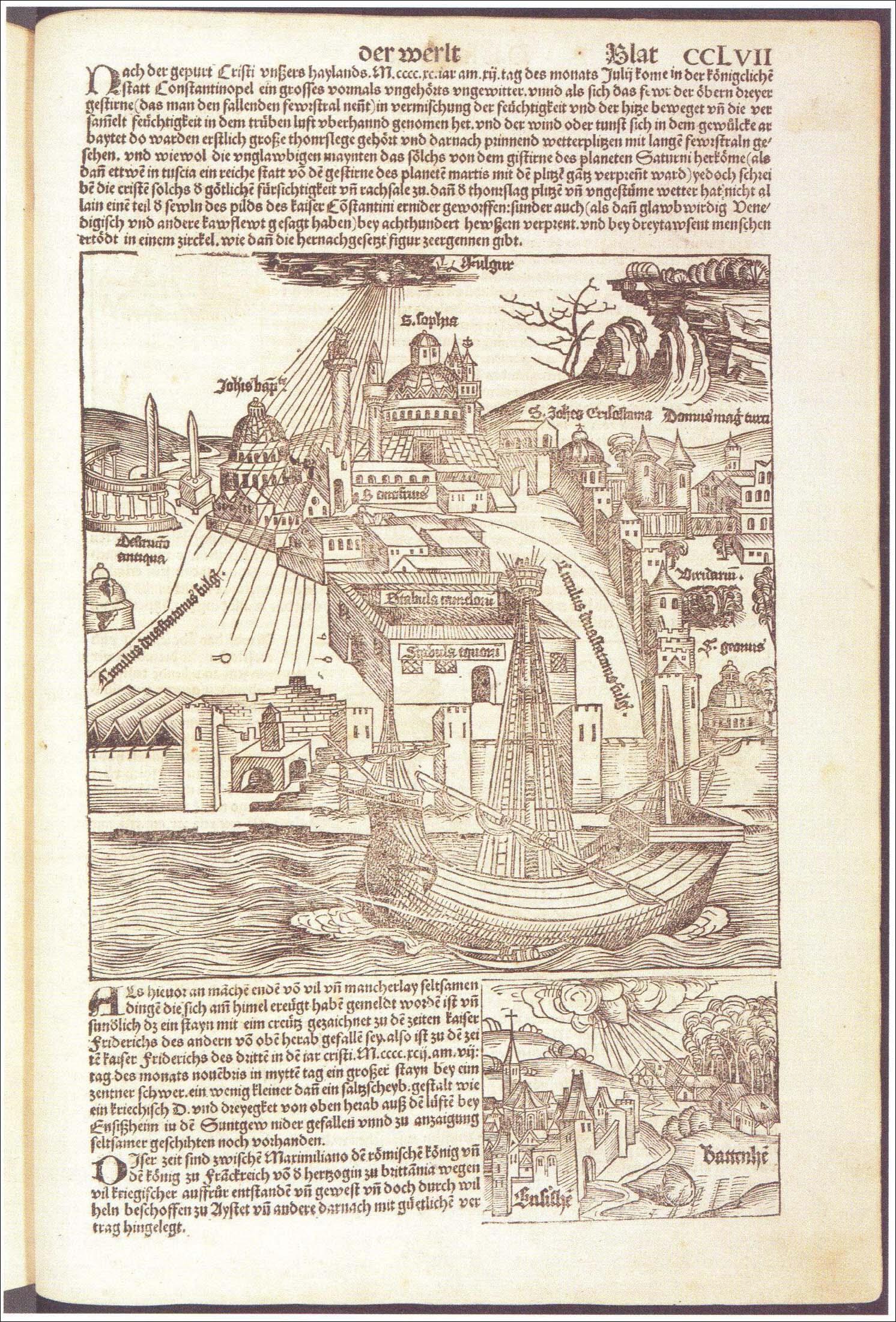 Hartmann Schedel: Liber chronicarum, dt. [Nürnberg, Anton Koberger, 23. Dezember 1493, Ex. SBB, Inc. 1746, Bl. 267r]. Quelle: Becker, P. J. / Overgaauw, E. (Hgg.): Aderlaß und Seelentrost. Die Überlieferung deutscher Texte im Spiegel Berliner Handschriften und Inkunabeln (Staatsbibliothek zu Berlin — Preuß. Kulturbesitz Ausstellungskataloge NF 48). Mainz 2003, Kat. 199.