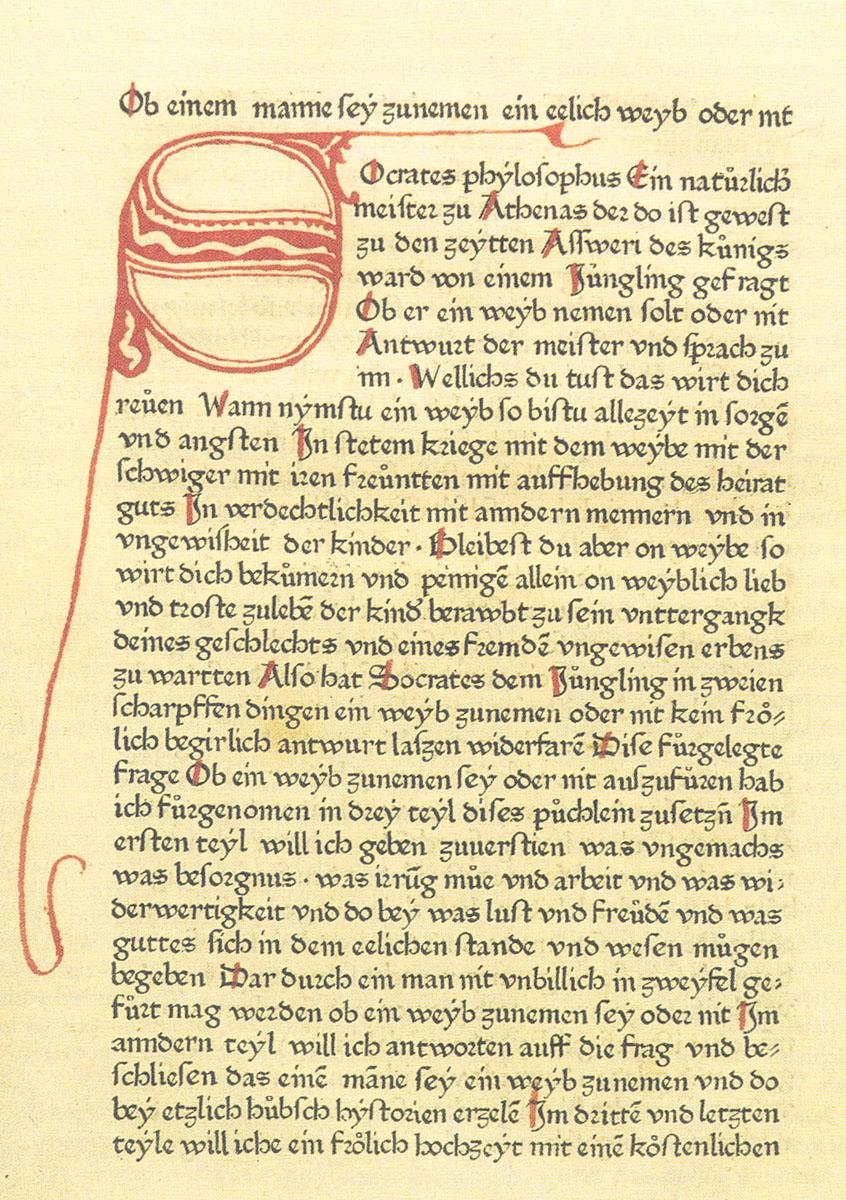 Quelle: Rautenberg, U. (Hg.): Über die Ehe. Von der Sachehe zur Liebesheirat. Eine Literaturausstellung in der Bibliothek Otto Schäfer, Schweinfurt 18. April — 31. Oktober 1993. Schweinfurt 1993, S. 49, Abb. 4. ![]() Zugeordnet bei: