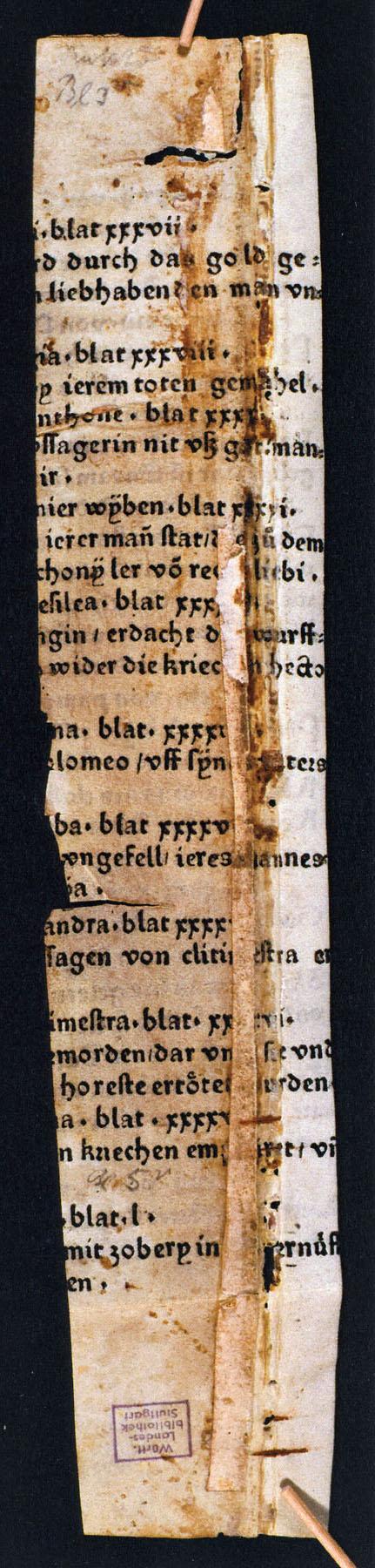 [ Druckansicht ] Zoom: [ + ] [ 1:1 ] [ Standard ] [ - ] [ Abb. vergrößert in extra Fenster öffnen ]Zum Scrollen der Abbildung bitte die unter dem Bild angebrachte Scrollleiste bedienen. Quelle: Stuttgart, WLB, Frgm. I/2, ohne Signatur (an Inc 2° 3333) (mit freundlicher Genehmigung der WLB).Zugeordnet bei:MRFH 20410 Ulm: Johann Zainer, [vor dem 28. März 1474] (Druckbeschreibung)