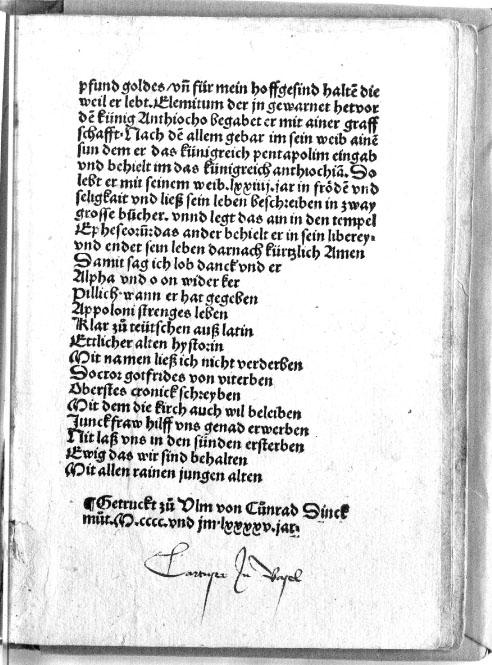 [ Druckansicht ] Zoom: [ + ] [ 1:1 ] [ Standard ] [ - ] [ Abb. vergrößert in extra Fenster öffnen ]Zum Scrollen der Abbildung bitte die unter dem Bild angebrachte Scrollleiste bedienen. Quelle: Basel (CH), UB, FP VIII2 3:2 (mit freundlicher Genehmigung der ÖB).Zugeordnet bei:MRFH 20230 Ulm: Konrad Dinckmut, 1495 (Druckbeschreibung)