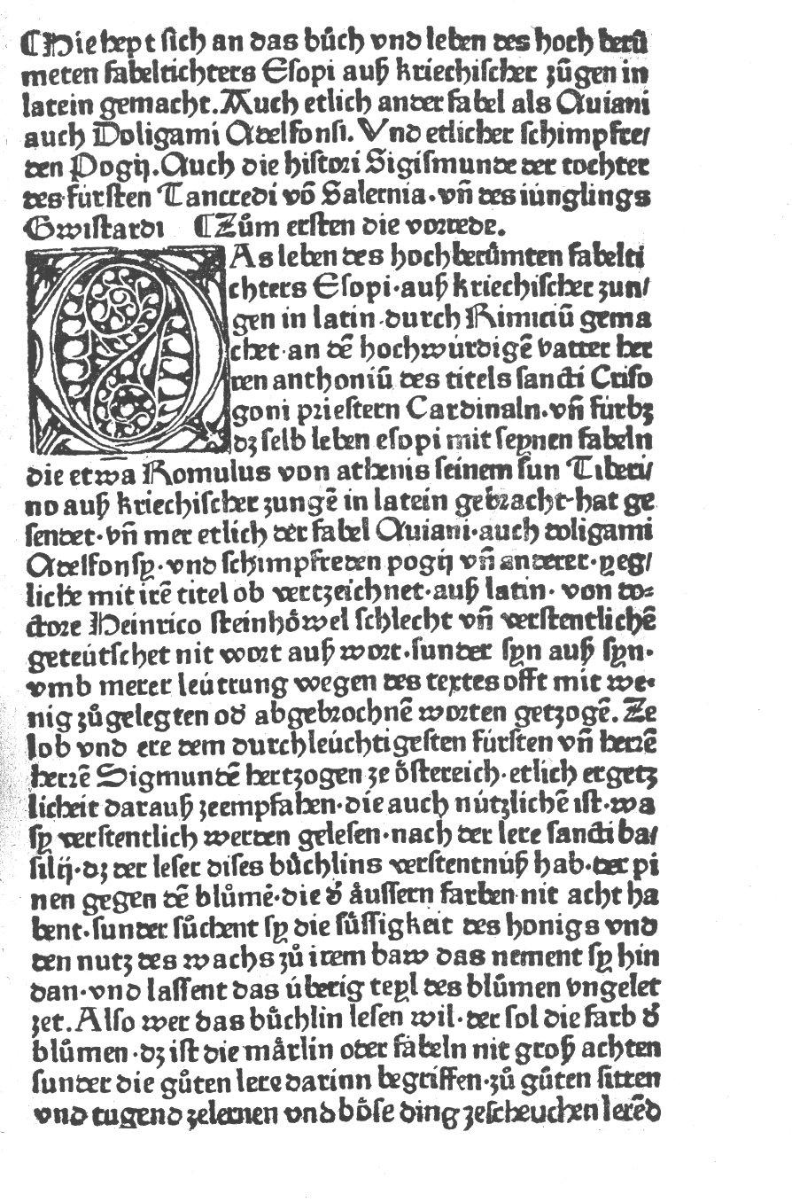 [ Druckansicht ] Zoom: [ + ] [ 1:1 ] [ Standard ] [ - ] [ Abb. vergrößert in extra Fenster öffnen ]Zum Scrollen der Abbildung bitte die unter dem Bild angebrachte Scrollleiste bedienen. Quelle: Esopus, übersetzt von Heinrich Steinhöwel, gedruckt von Günther Zainer in Augsburg um 1477/78. Nachwort von E. Voulliéme. Potsdam 1921.Zugeordnet bei:MRFH 20020 [Augsburg: Günther Zainer, um 1477/78] (Druckbeschreibung)