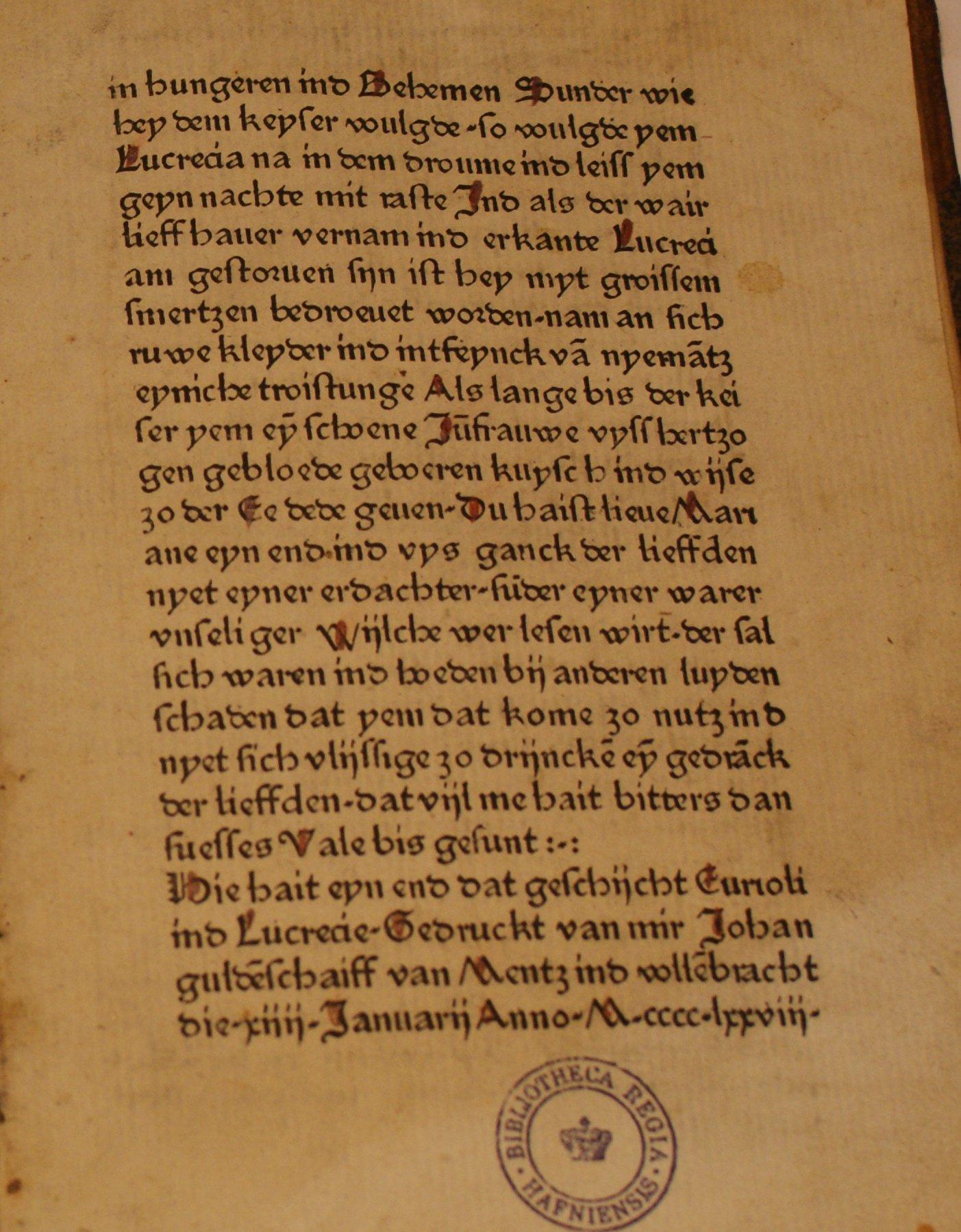 [ Druckansicht ] Zoom: [ + ] [ 1:1 ] [ Standard ] [ - ] [ Abb. vergrößert in extra Fenster öffnen ]Zum Scrollen der Abbildung bitte die unter dem Bild angebrachte Scrollleiste bedienen. Quelle: København (DK), KglB, Department of Manuscripts & Rare Books, Inc. Haun., 3247 kvart. 77:1,37 (mit freundlicher Genehmigung der KglB).Zugeordnet bei:MRFH 21220 [Köln]: Johann Guldenschaff, 14. Januar 1478 (Druckbeschreibung)