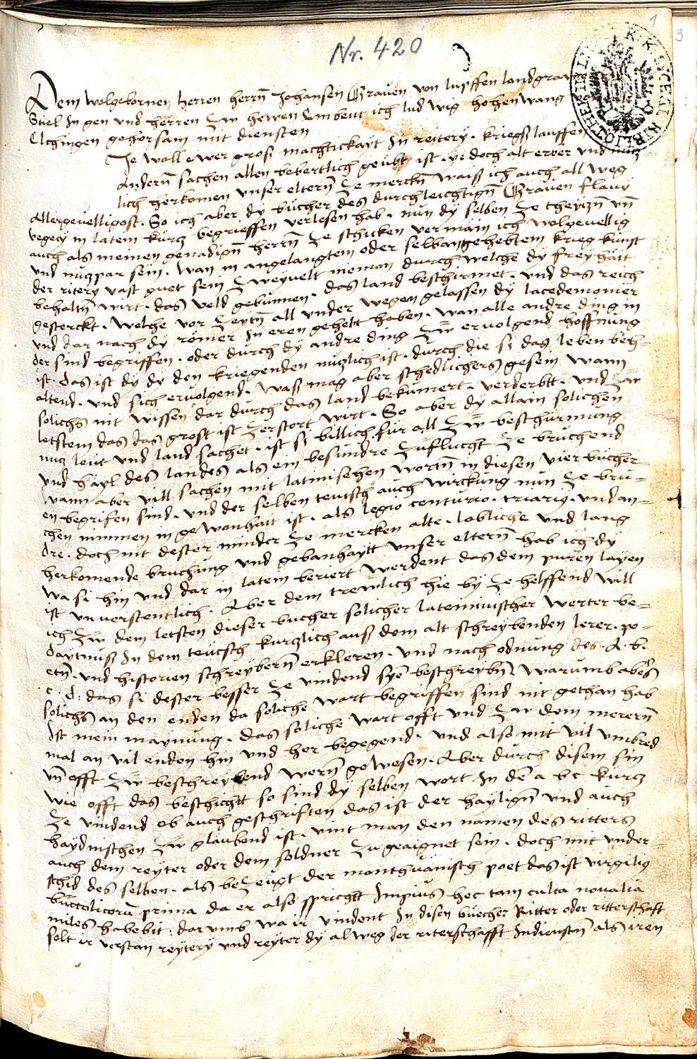 [ Druckansicht ] Zoom: [ + ] [ 1:1 ] [ Standard ] [ - ] [ Abb. vergrößert in extra Fenster öffnen ]Zum Scrollen der Abbildung bitte die unter dem Bild angebrachte Scrollleiste bedienen. Quelle: Linz, Oberösterreichische Landesbibliothek, Cod. 420, S. 1Zugeordnet bei:MRFH 10535 Linz (A), Oberösterreichische Landesbibliothek, Cod. 420 (früher: Studienbibliothek, Cc V 11) (Handschriftenbeschreibung)